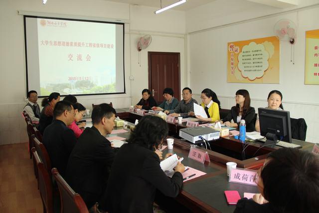 近年来,我校大学生思想道德素质提升工程建设取得了一定成绩,目前在建的省级项目有2个示范项目,4个特色成长辅导室项目,2个优秀辅导员团队项目和5个德育实践项目。为加强项目管理,促进项目建设,5月12日下午,学工部在综合楼425室组织召开大学生思想道德素质提升工程省级项目建设交流会,会议邀请了长沙理工大学学工部副部长龚勋现场指导,副校长周美林,各项目负责人、系部书记干事、学生处领导及相关工作人员参加会议。校长助理/学工部长成荷萍主持会议。