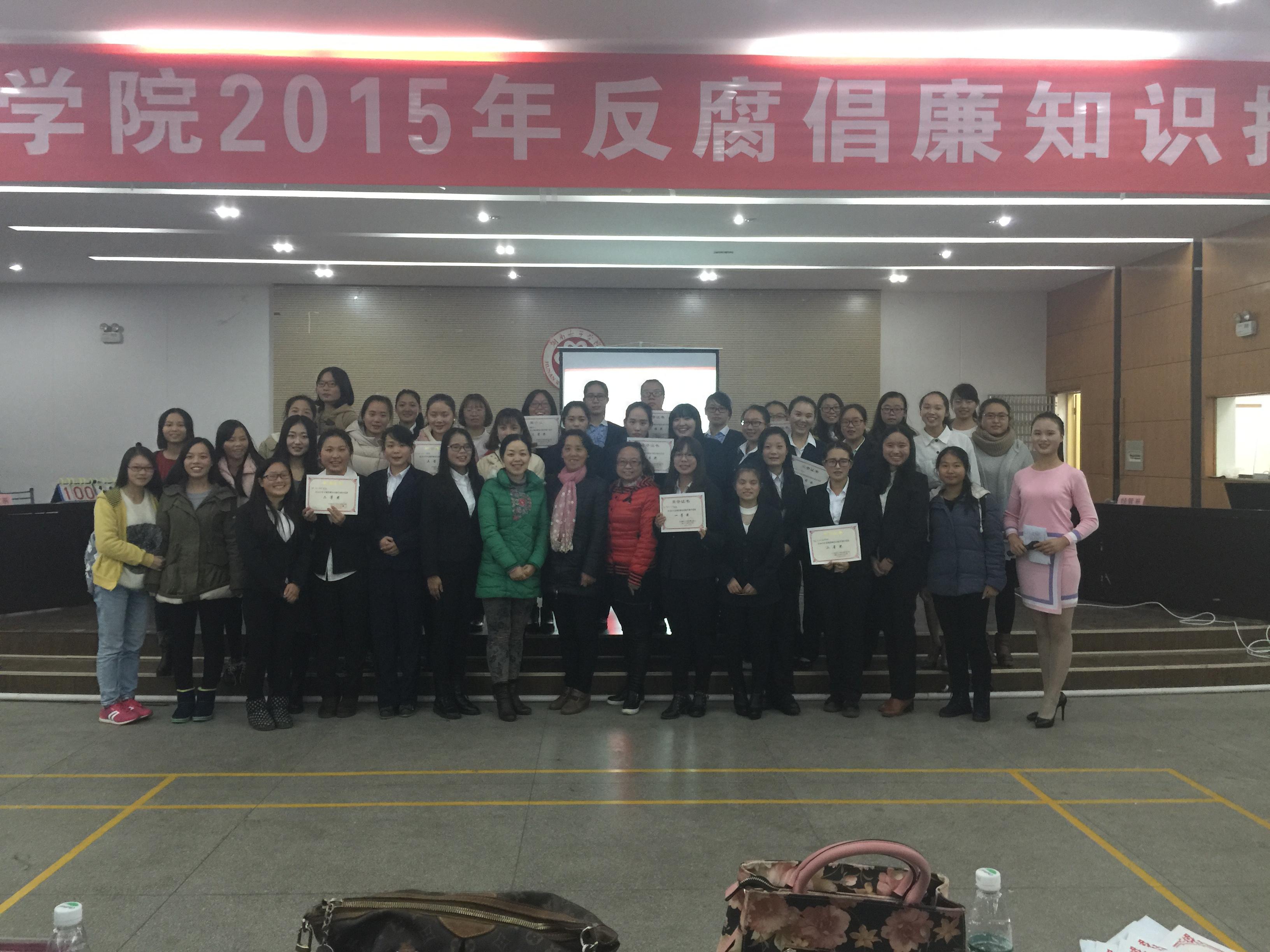 (学生工作部 蔡琼)2015年11月27日,由我校纪委主办、学工部承办的2015年反腐倡廉知识抢答赛在北院二食堂三楼大学生活动中心成功举办。担任此次比赛评委的是校纪委的刘娟老师、学工部的汪耿和蔡琼老师,15级全体入党积极分子300余人观看了这次比赛。 本次比赛分为必答题、抢答题、风险题三个环节,参赛选手由来自全校9个系的精英组成。必答题环节选手们胸有成竹、沉着应战,比分不相上下;抢答题环节选手们全神贯注、争先恐后,将比分拉开差距;最精彩的就是风险题环节,有的参赛队大胆冲击、险中求胜,有的则仔细思量、谨慎选择。三个环节结束后,因两个组的总分相同,便进行加时赛一决高低。加时赛后,评委们对参赛情况进行点评,肯定同学们对反腐倡廉知识和比赛的重视,并希望同学们能更积极地关注相关信息、传播正能量,使在场同学们的学习兴趣大增。经过一番激烈角逐后,文学与传媒系获得一等奖,外语系、经济与管理系获得二等奖,艺术表演系、艺术设计系、教育与法学系获得三等奖,信息技术系、旅游系、会计系获得优胜奖。最后,评委们为得奖选手现场颁发证书,并和参赛选手及所有工作人员合影留念。 此次知识竞赛活动达到了以赛促学、以学促廉的效果,有利于广大师生员工深刻领会反腐倡廉工作内涵,充分认识新形势下加强反腐倡廉建设的意义,进一步增强廉洁自律意识,从而营造阳光健康的校园文化。