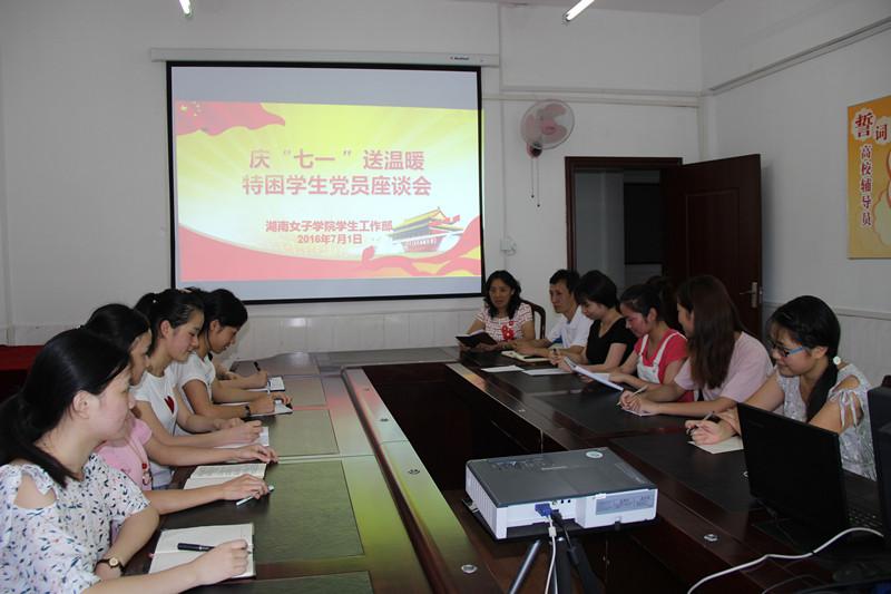 (学生处 陈知湘)根据学校党委关于做好庆祝中国共产党成立95周年有关工作的要求,结合“两学一做”学习教育实施计划,7月1日下午3点,在综合楼425会议室慰问了我校8名特困学生党员并召开了座谈会。 座谈会由我校学生工作处副处长汪耿同志主持。首先,汪耿同志代表学生工作处向所有特困学生党员表示亲切问候,邀请大家齐聚一堂以座谈会的形式庆祝“七一”党的生日。随后,8名特困学生党员结合自身的学习、工作、入党经历及人生感悟等分别发言,各位畅所欲言,从自身的情况讲述了作为一名党员在女子学院的经历,党的引领让自己从一个懵懂的孩子,成长为有信念,有理想、有追求的人。一致认为:特困学生要从思想上、行为上、组织上真正入党,要经得起任何风吹浪打的考验,时刻起到旗帜和标杆作用。汪耿同志从特困学生党员的实际情况出发,勉励学生:困难是暂时的,它是绊脚石,也是垫脚石,放下思想包袱,不忘初心,不忘初衷,处处以党员的标准严格要求自己,努力提高专业素养、文化素养,在学习和生活中起到先锋模范作用。 最后,到会的8位特困学生党员在党的生日里每人收到了一份特殊的礼物----慰问费。
