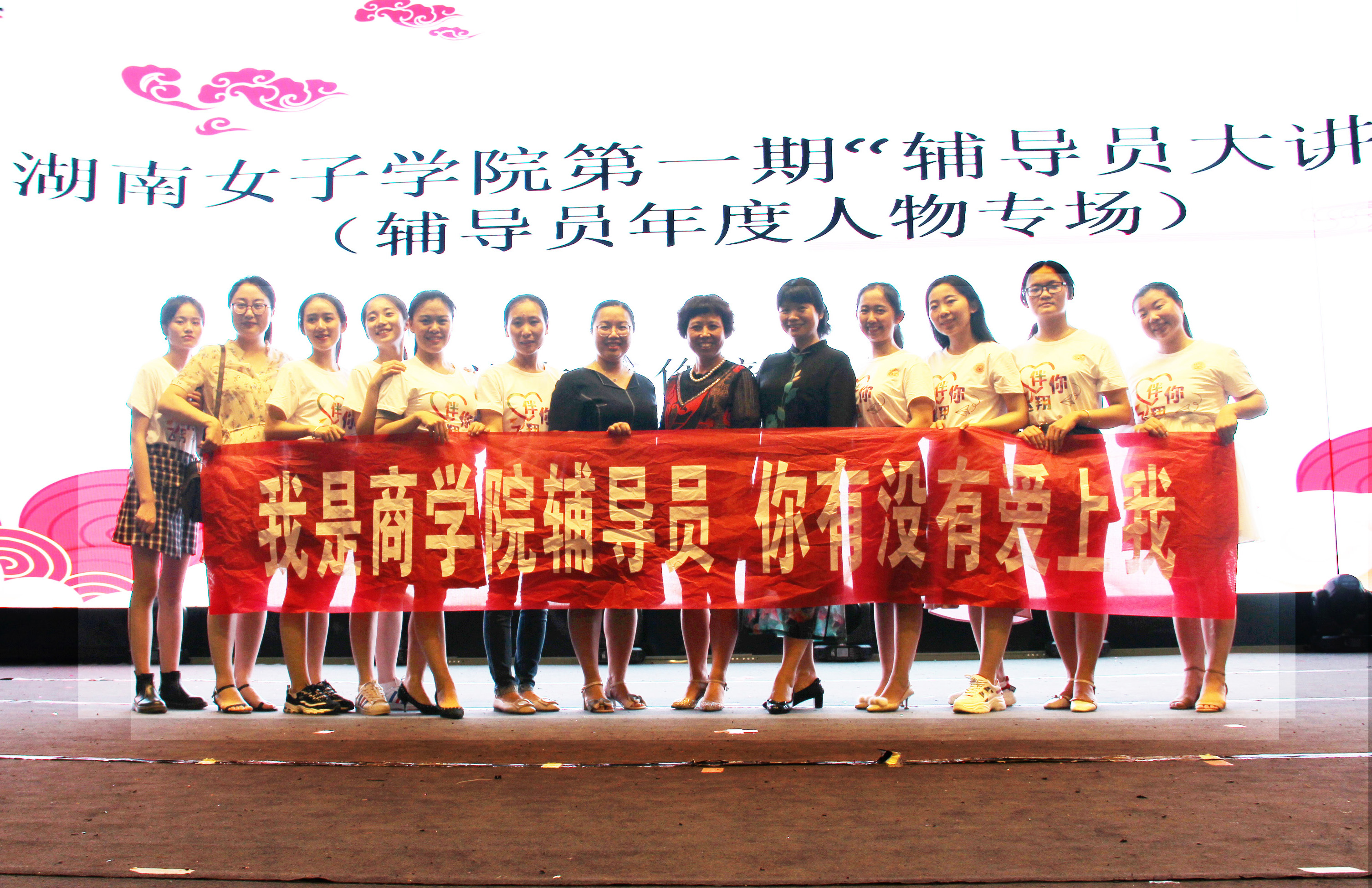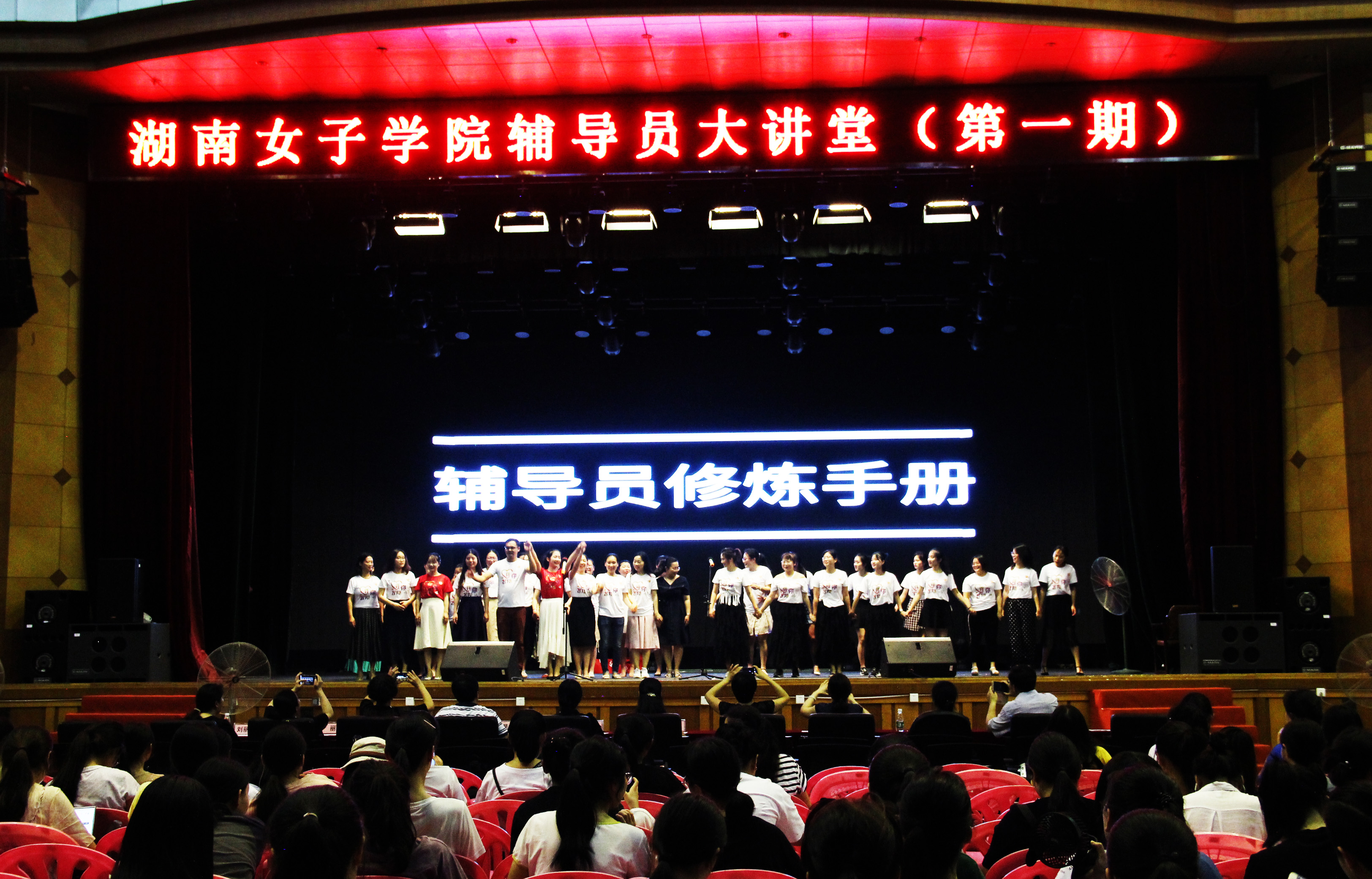 最后,蔣璟萍及出席大讲堂的各位领导高兴地上台与全体辅导员及工作人员合影留念。