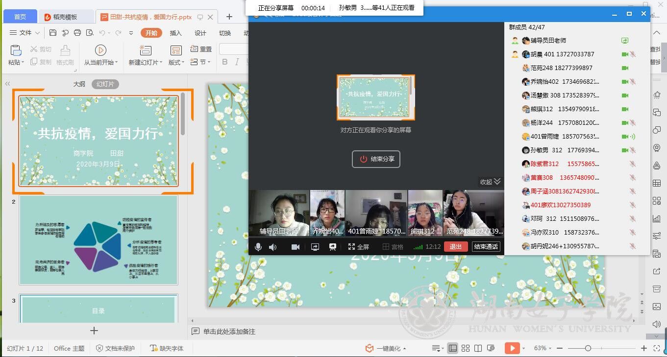 本网讯(学生工作部 吴长庚 范世明)2020年3月9日14点30分至16点,湖南女子学院组织万名女生在线观看教育部社会科学司、人民网联合举办的“全国大学生同上一堂疫情防控思政大课”直播,直播结束后,在全体辅导员、班主任的具体组织下,全校240多个班级通过“学习强国”、“钉钉”、“腾讯”、“瞩目”等网络平台,紧接着举行“共抗疫情、爱国力行”线上主题班会,各班同学和老师就学习这堂大课的所思所感所悟,进行了认真而热烈的分享和讨论。<?xml:namespace prefix = o />