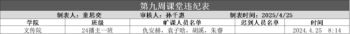 为进一步强化学风建设,引导学生培养正确的学习习惯,切实提升学生的学习积极性,全力构建积极向上的学习氛围与文明有序的校园环境。在学工部的统筹部署下,2025年4月21日至2025年4月25日,大学生自我管理委员会开展了校园文明督查,学风建设督查。现将相关情况通报如下: