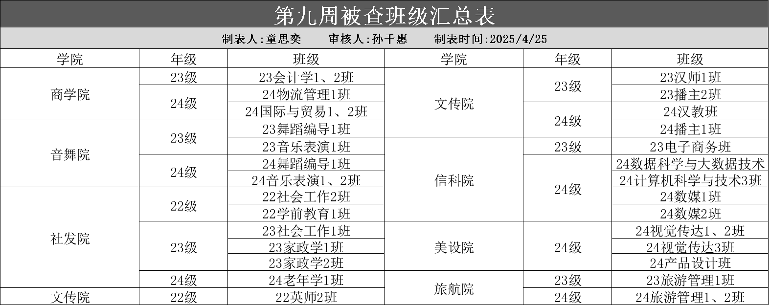 以上为大学生自我管理委员会公布第九周查课、文明督查通报。希望全校学生以此为鉴,严格遵守学校各项管理规定,强化纪律意识与大局观念,充分展现女院学子的卓越学风和高尚品德。