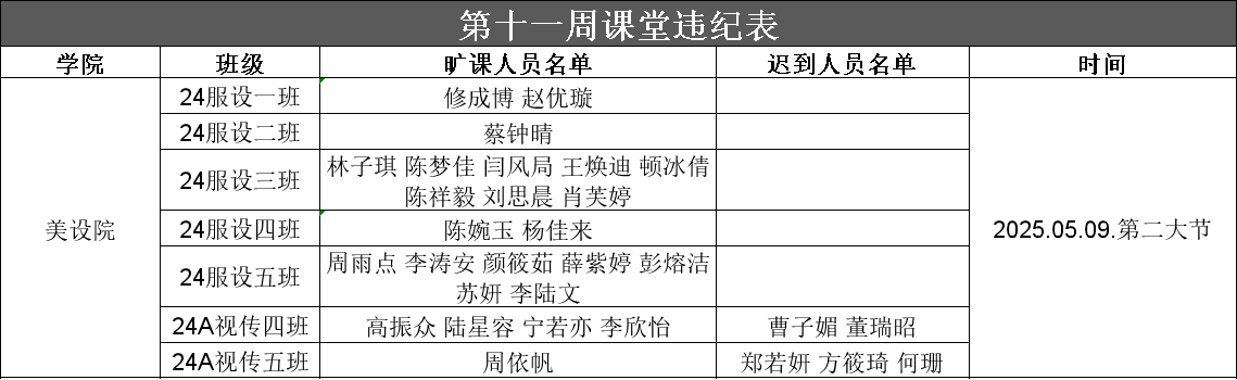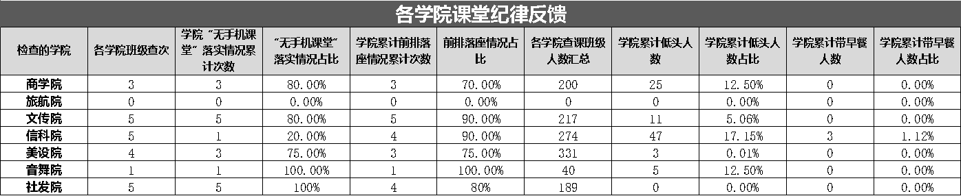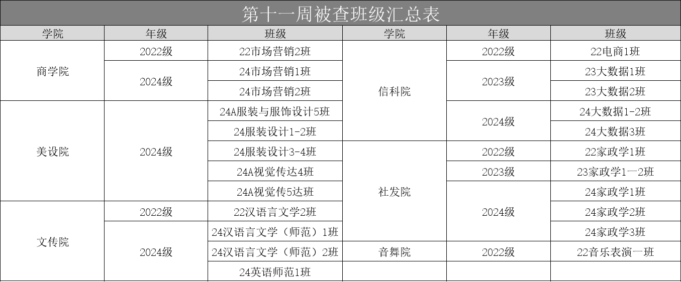 以上为大学生自我管理委员会公布第十一周查课、文明督查通报。希望全校学生以此为鉴,严格遵守学校各项管理规定,强化纪律意识与大局观念,充分展现女院学子的卓越学风和高尚品德。
