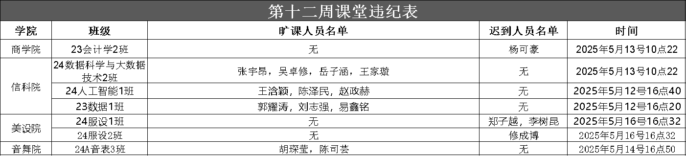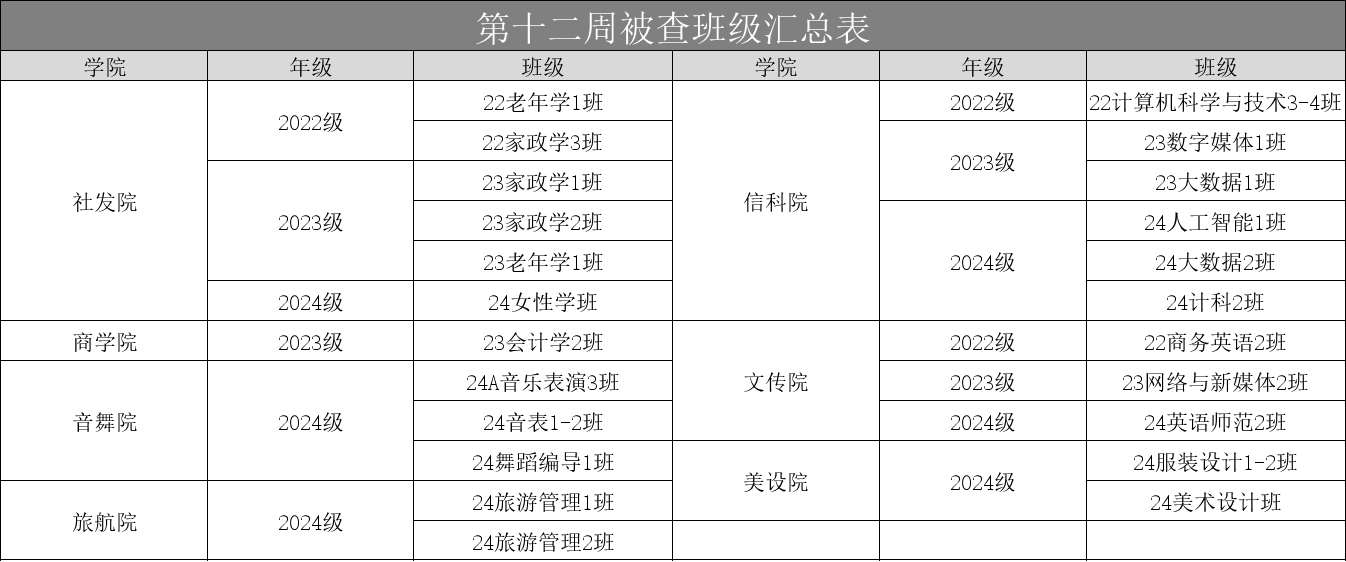 以上为大学生自我管理委员会公布第十二周查课、文明督查通报。希望全校学生以此为鉴,严格遵守学校各项管理规定,强化纪律意识与大局观念,充分展现女院学子的卓越学风和高尚品德。