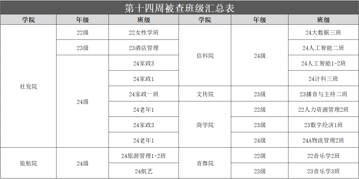 以上为大学生自我管理委员会公布第十四周查课、文明督查通报。希望全校学生以此为鉴,严格遵守学校各项管理规定,强化纪律意识与大局观念,充分展现女院学子的卓越学风和高尚品德。