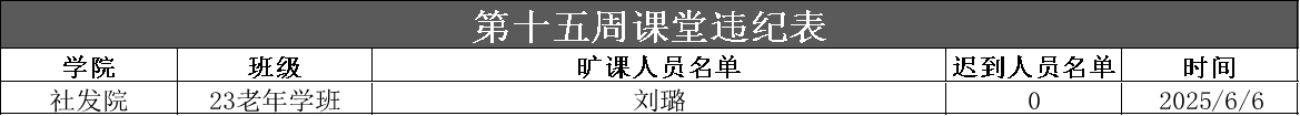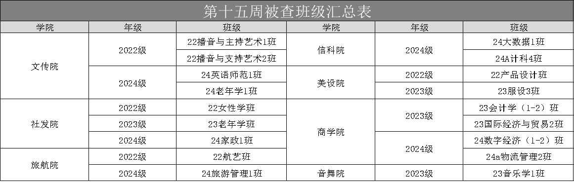 以上为大学生自我管理委员会公布第十五周查课、文明督查通报。希望全校学生以此为鉴,严格遵守学校各项管理规定,强化纪律意识与大局观念,充分展现女院学子的卓越学风和高尚品德。