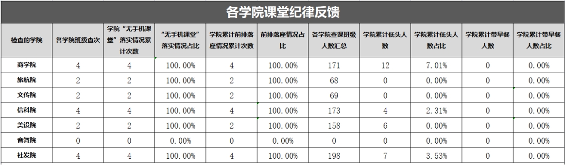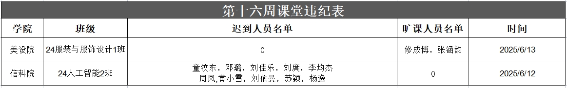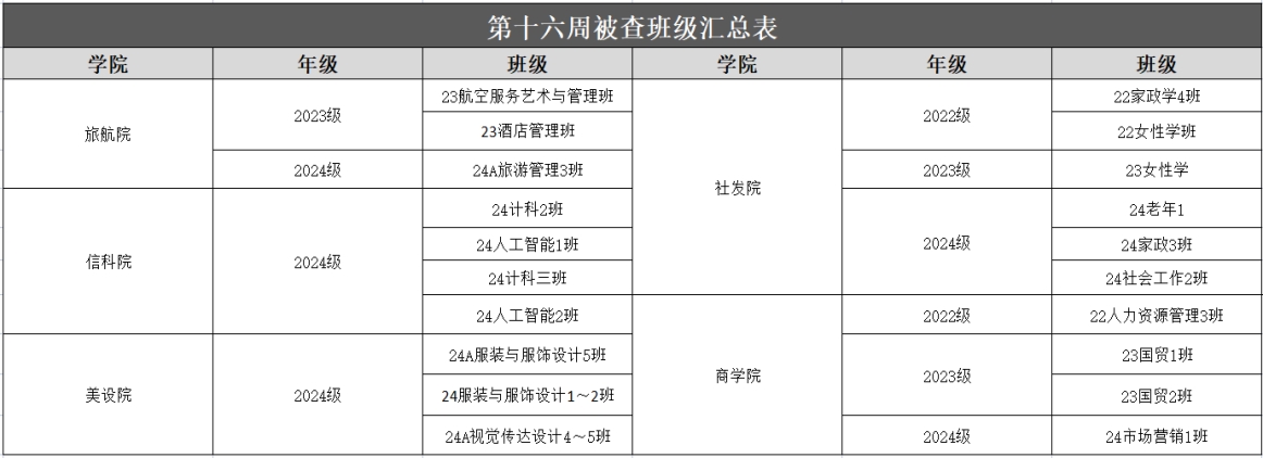 以上为大学生自我管理委员会公布第十六周查课、文明督查通报。希望全校学生以此为鉴,严格遵守学校各项管理规定,强化纪律意识与大局观念,充分展现女院学子的卓越学风和高尚品德。