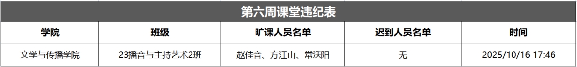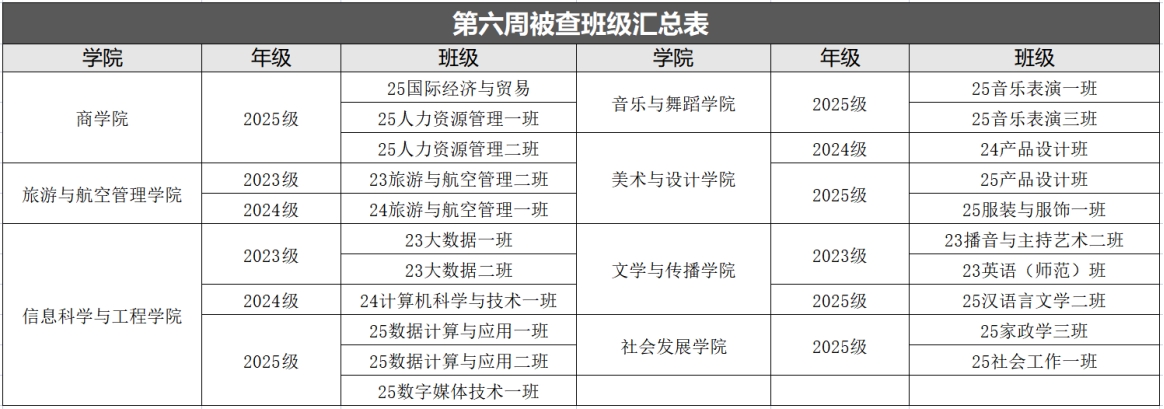 以上为大学生自我管理委员会公布第六周查课、文明督查通报。希望全校学生以此为鉴,严格遵守学校各项管理规定,强化纪律意识与大局观念,充分展现女院学子的卓越学风和高尚品德。