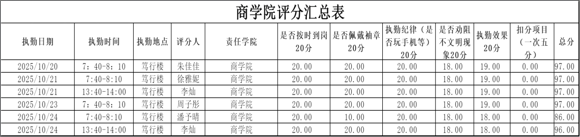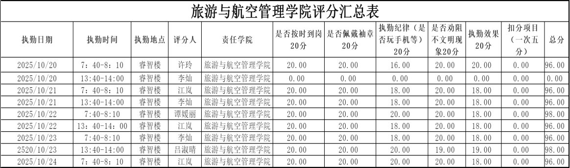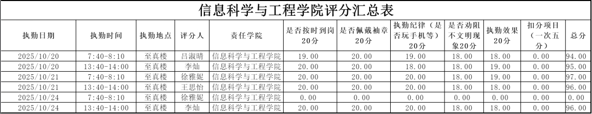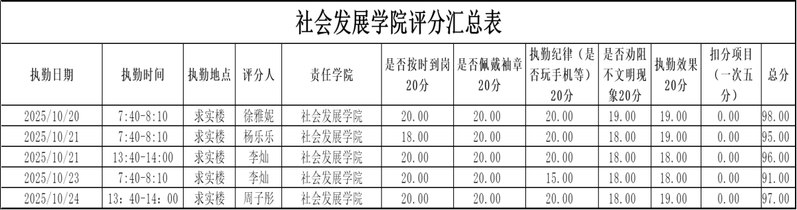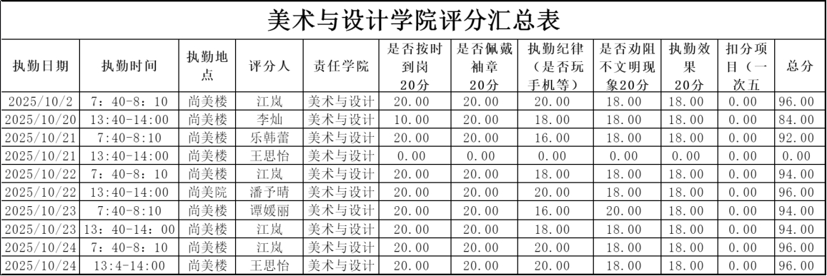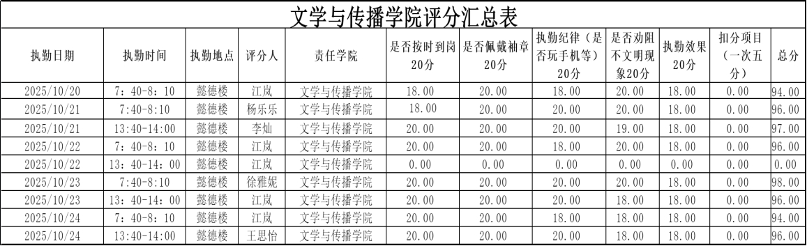 湖南女子学院文明督导员执勤情况评分汇总表(10月24日) |