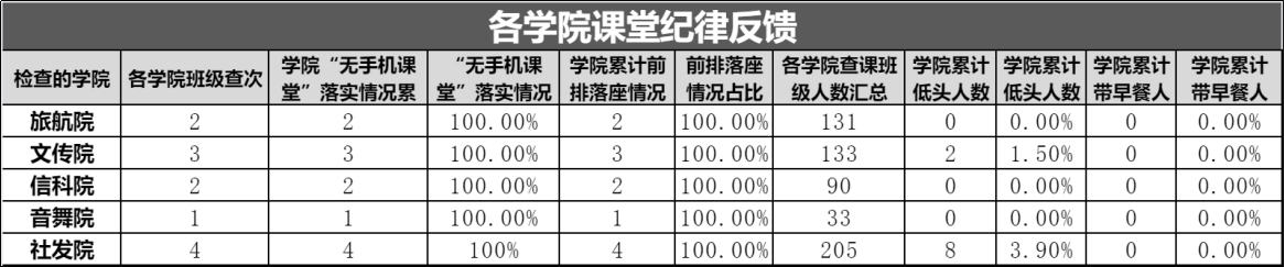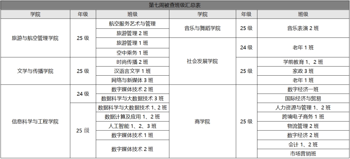 以上为大学生自我管理委员会公布第七周查课、文明督查通报。希望全校学生以此为鉴,严格遵守学校各项管理规定,强化纪律意识与大局观念,充分展现女院学子的卓越学风和高尚品德。