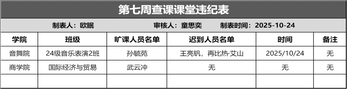 为进一步强化学风建设,引导学生培养正确的学习习惯,切实提升学生的学习积极性,全力构建积极向上的学习氛围与文明有序的校园环境。在学工部的统筹部署下,2025年10月20日至2025年10月24日,大学生自我管理委员会开展了校园文明督查,学风建设督查。现将相关情况通报如下: