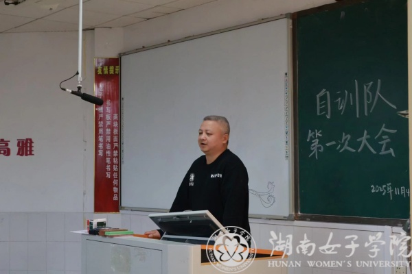 本网讯(学生工作部 陈 翊 毛诗晴)2025年11月4日中午12点30分,湖南女子学院第八届学生教官自训队第一次全体大会于睿智楼308室举行。由指导老师陈翊及全体新老队员共同参加。会议在管理部部长曹芮宁的主持下有序进行。各部门、连长依次围绕前三周训练问题与下一阶段未来规划做了详细汇报。