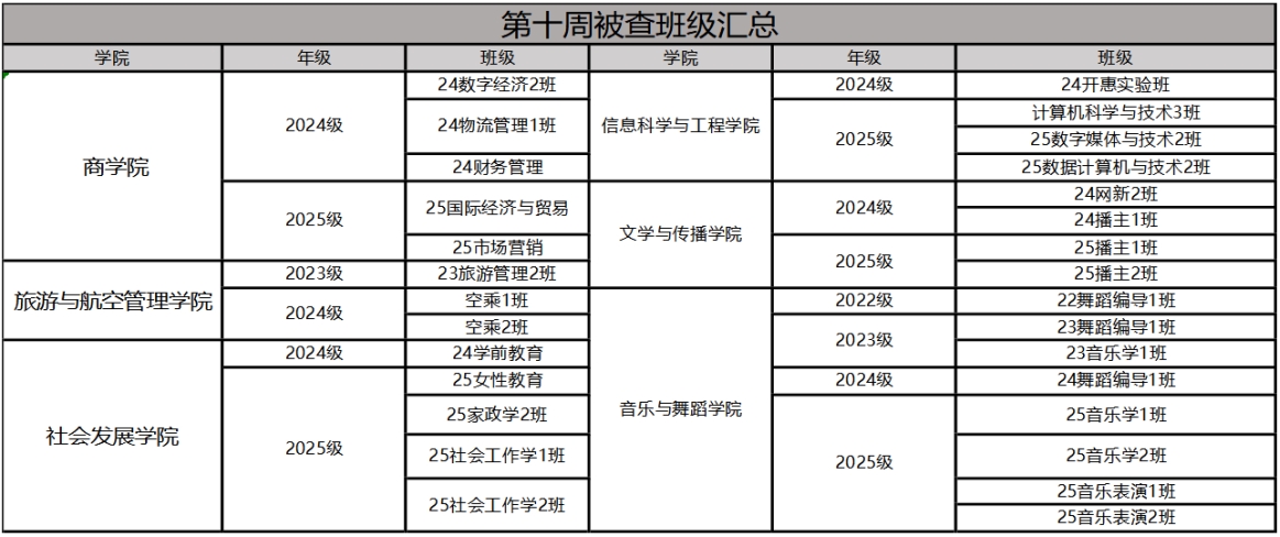 以上为大学生自我管理委员会公布第十周查课、文明督查通报。希望全校学生以此为鉴,严格遵守学校各项管理规定,强化纪律意识与大局观念,充分展现女院学子的卓越学风和高尚品德。