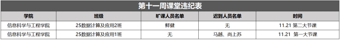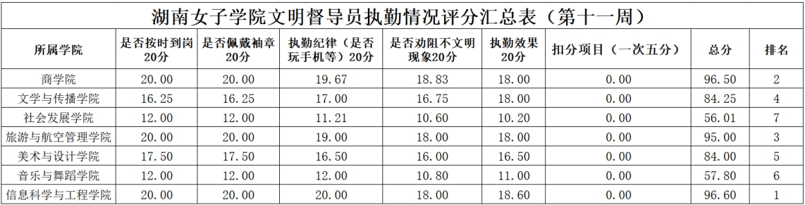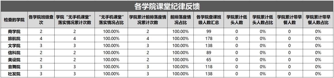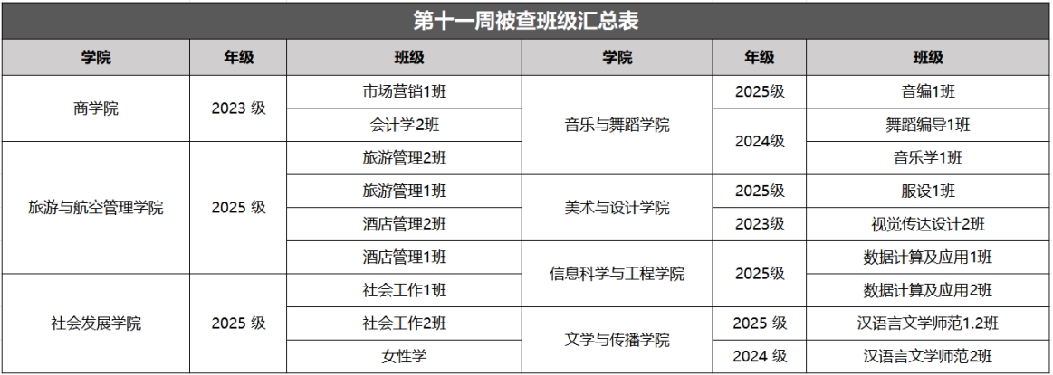 以上为大学生自我管理委员会公布第十一周查课、文明督查通报。希望全校学生以此为鉴,严格遵守学校各项管理规定,强化纪律意识与大局观念,充分展现女院学子的卓越学风和高尚品德。