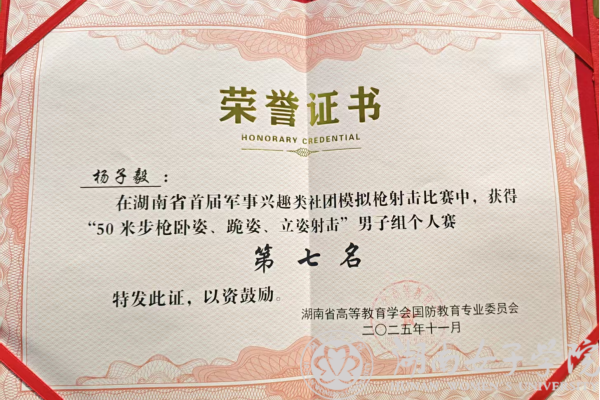 (本网讯 学生处陈 翊 刘雅雯报道)为纪念中国人民抗日战争暨世界反法西斯战争胜利80周年,全面深化高校国防教育实践,2025年11月22日,由湖南省高等教育学会国防教育专业委员会主办、湖南大学与湖南农业大学联合承办的湖南省首届高校军事兴趣类社团模拟枪射击暨国旗护卫队风采展示比赛在湖南农业大学举行。我校参赛队员杨子毅荣获“50米步枪卧姿、跪姿、立姿射击”项目男子组第七名,为学校赢得荣光。