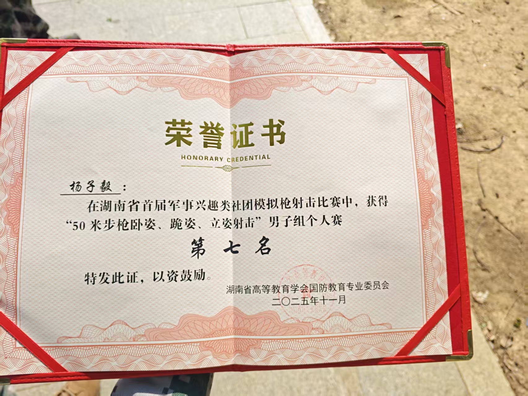 (本网讯 学生处陈 翊 刘雅雯报道)为纪念中国人民抗日战争暨世界反法西斯战争胜利80周年,全面深化高校国防教育实践,2025年11月22日,由湖南省高等教育学会国防教育专业委员会主办、湖南大学与湖南农业大学联合承办的湖南省首届高校军事兴趣类社团模拟枪射击暨国旗护卫队风采展示比赛在湖南农业大学举行。我校参赛队员杨子毅荣获“50米步枪卧姿、跪姿、立姿射击”项目男子组第七名,为学校赢得荣光。