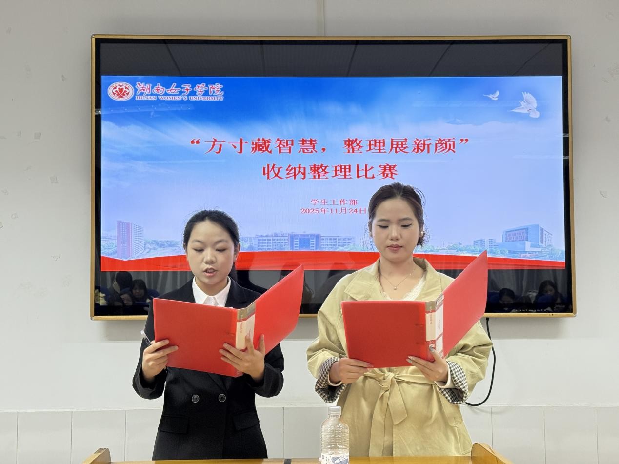本网讯(学工部 杜洋)2025年11月26日晚7时,由学生工作部主办、自治委承办的“方寸藏智慧,整理展新颜”收纳整理比赛在睿智楼109教室拉开帷幕。宿舍管理中心主任陈春梅、学生资助中心主任范梅、社发院宿管专干杨亚涛、各学院寝室长代表等百余人参与活动。学生工作部部长刘利华、副部长张娟,文学与传播学院党委副书记李婷婷对学生宿舍开展实地指导,并特邀优秀校友、长沙市住美商业服务有限责任公司负责人肖思嘉进行教学。