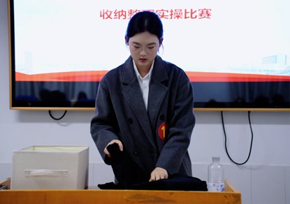 比赛分为三个环节:首先,11位参赛选手通过2分钟演讲分享收纳习惯与心得,喊出参赛口号;随后进入理论知识抢答环节,选手们围绕收纳原则、空间利用等题目展开激烈角逐,现场气氛热烈;最终环节为实操比拼,选手们分组对衣物进行分类整理与收纳,评委依据效率、美观度、实用性等标准现场打分。肖思嘉针对选手表现逐一点评,强调“收纳不仅是技巧,更是生活态度的体现”。宿舍管理中心主任陈春梅在总结中勉励学生:“一屋不扫何以扫天下?希望同学们以劳动为舟,驶向更自律的人生。”
