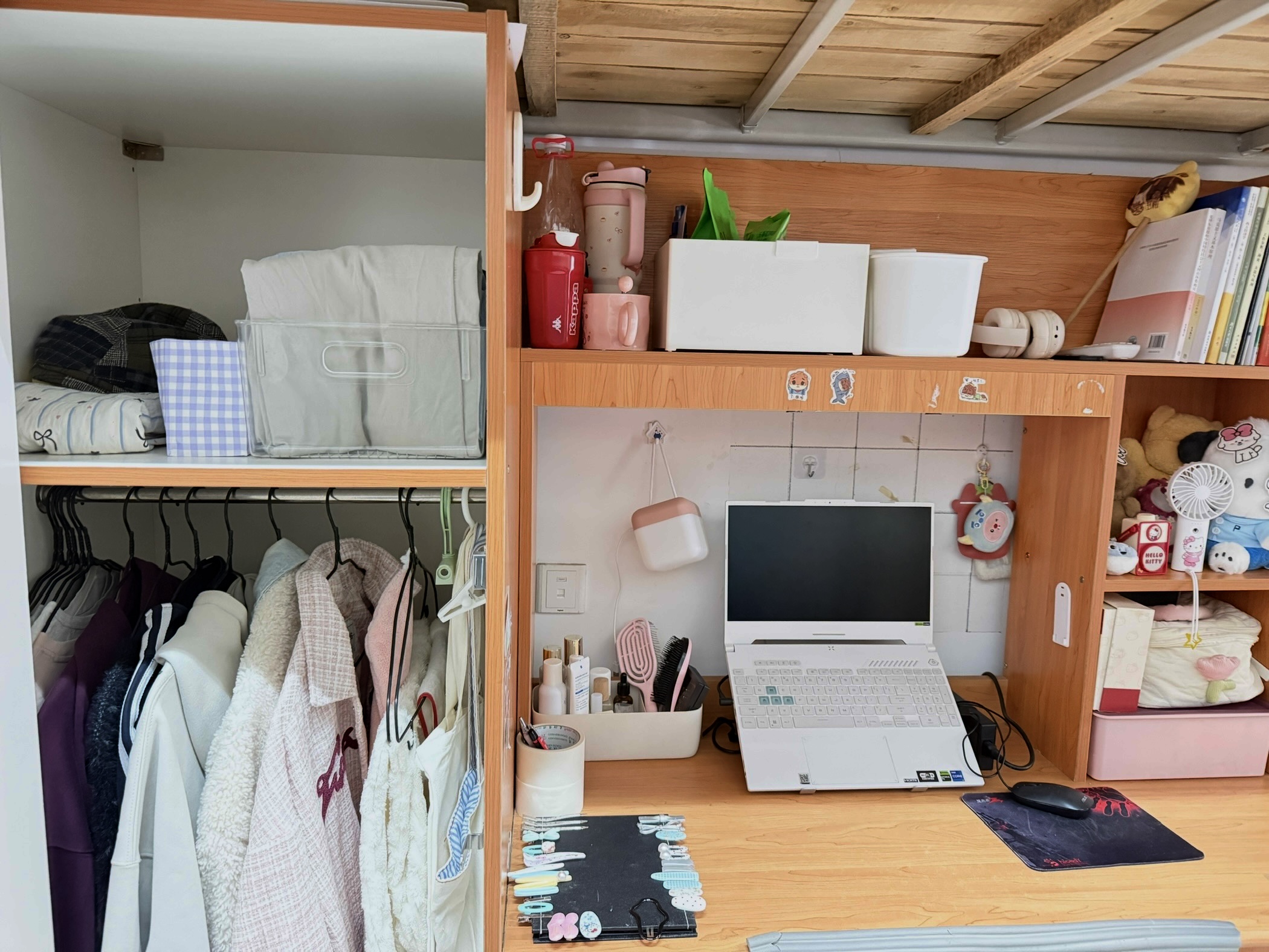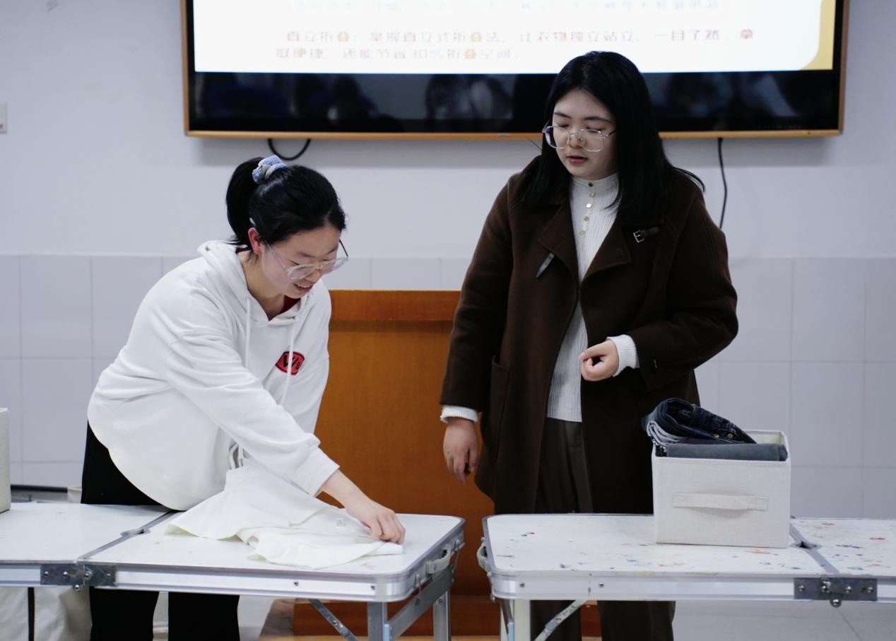 比赛结束后,肖思嘉结合大学生生活习惯与我校宿舍特点,系统讲解收纳逻辑与技巧,并针对学生提出的“衣柜空间不足”“桌面杂乱”等问题现场支招。为深化实践效果,刘利华、张娟、李婷婷与肖思嘉分别深入北十栋、北七栋宿舍开展实地示范。他们从衣物折叠方法、收纳工具选择到整体空间规划进行手把手教学,针对宿舍存在的收纳痛点提出“分区管理”“垂直利用”等解决方案。经指导后的宿舍焕然一新,学生们惊叹:“原来收纳能让10平方米的空间发挥20平方米的价值!”