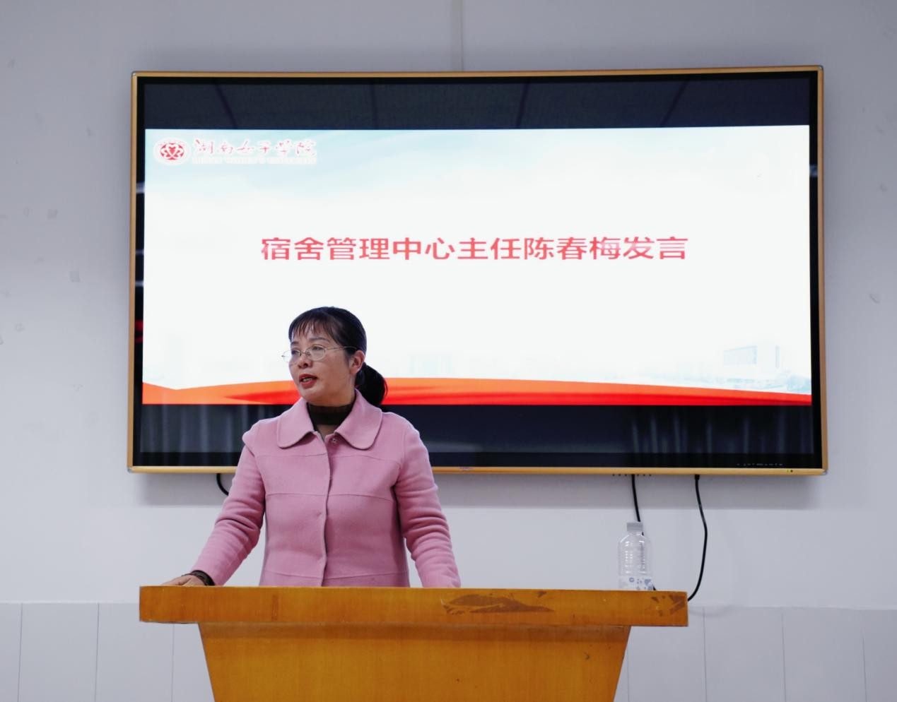本网讯(学工部 杜洋)2025年11月26日晚7时,由学生工作部主办、自治委承办的“方寸藏智慧,整理展新颜”收纳整理比赛在睿智楼109教室拉开帷幕。宿舍管理中心主任陈春梅、学生资助中心主任范梅、社发院宿管专干杨亚涛、各学院寝室长代表等百余人参与活动。学生工作部部长刘利华、副部长张娟,文学与传播学院党委副书记李婷婷对学生宿舍开展实地指导,并特邀优秀校友、长沙市住美商业服务有限责任公司负责人肖思嘉进行教学。