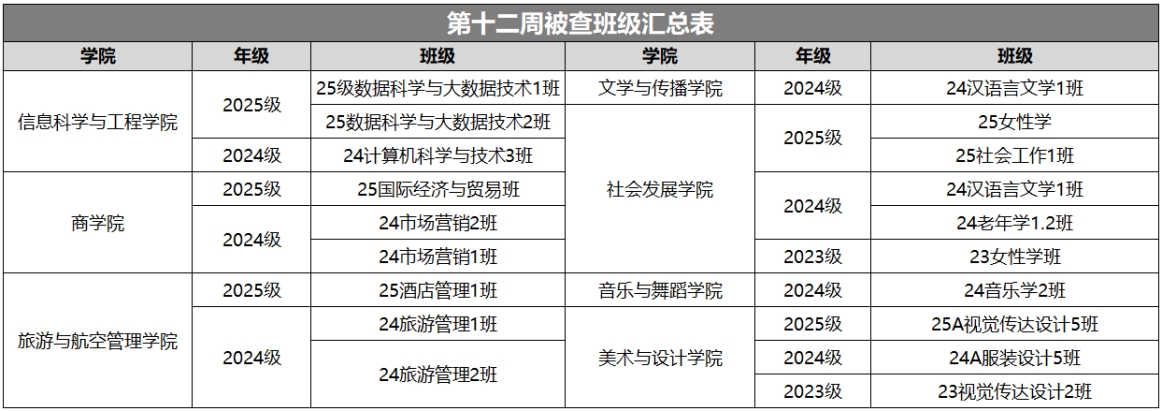 以上为大学生自我管理委员会公布第十二周查课、文明督查通报。希望全校学生以此为鉴,严格遵守学校各项管理规定,强化纪律意识与大局观念,充分展现女院学子的卓越学风和高尚品德。