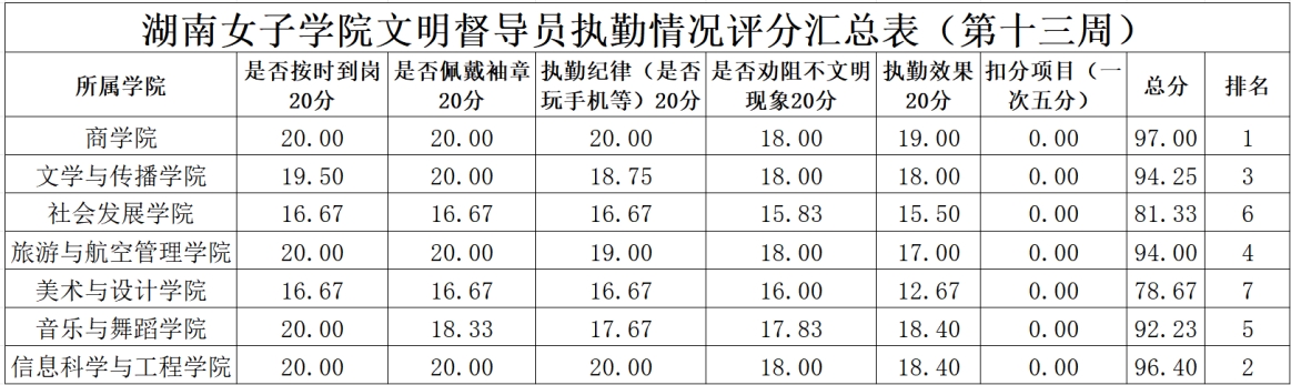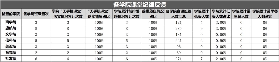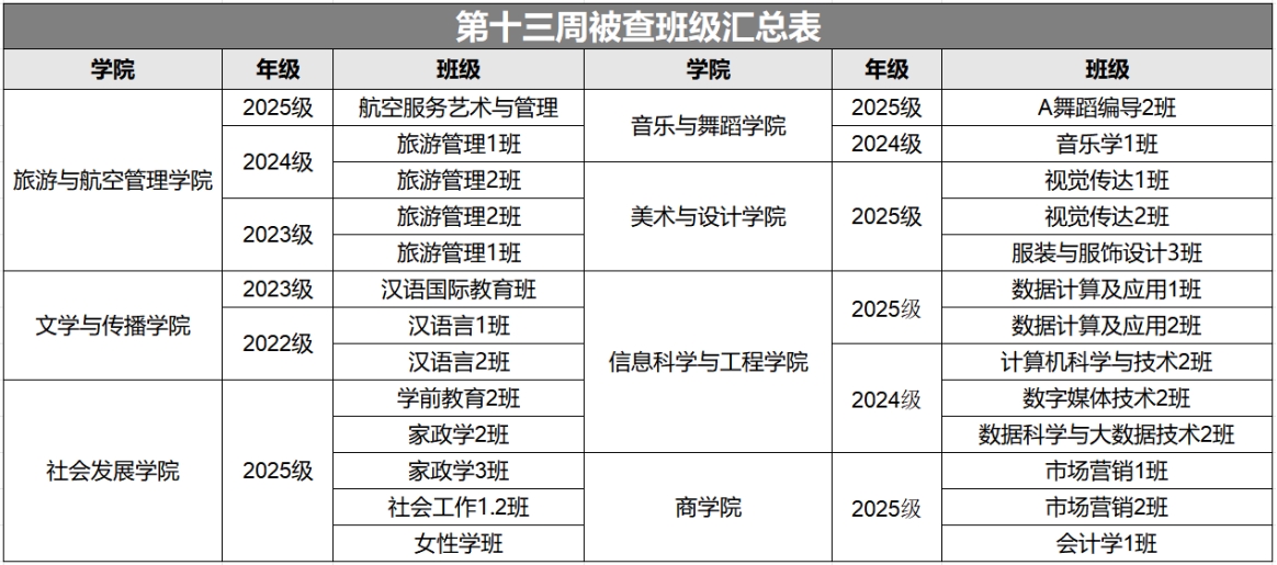 以上为大学生自我管理委员会公布第十三周查课、文明督查通报。希望全校学生以此为鉴,严格遵守学校各项管理规定,强化纪律意识与大局观念,充分展现女院学子的卓越学风和高尚品德。