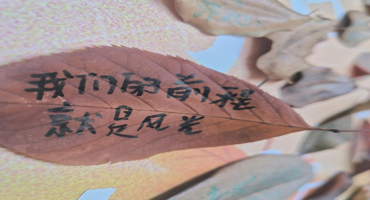 本次活动以自然为媒,为全校师生搭建起一个低成本却充满情感温度的心灵驿站。无需刻意准备,同学们只需俯身拾起一片飘落的树叶,便可将其化作承载情绪与思绪的独特“信笺”。有人在叶面上写下对未来的期许,有人留下对挚友的祝福,也有人记录下此刻的心情,或是一句送给自己的温柔鼓励。
