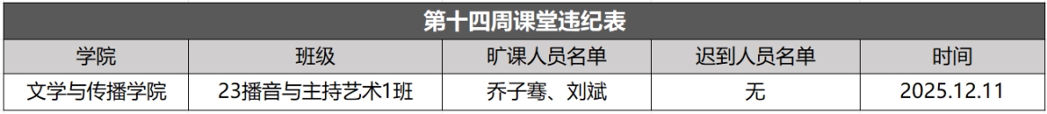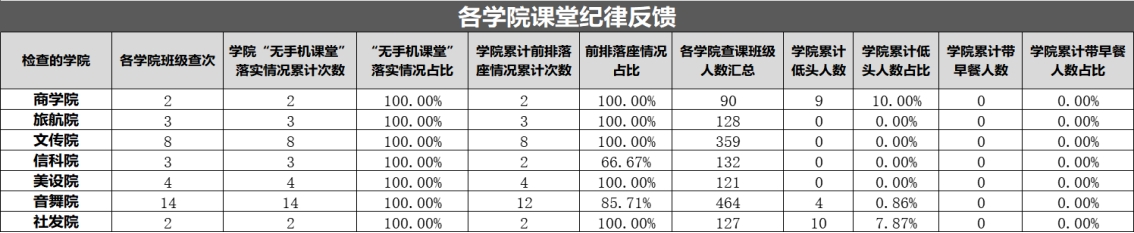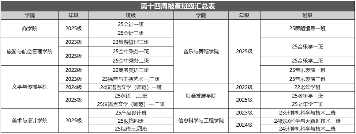 以上为大学生自我管理委员会公布第十四周查课、文明督查通报。希望全校学生以此为鉴,严格遵守学校各项管理规定,强化纪律意识与大局观念,充分展现女院学子的卓越学风和高尚品德。