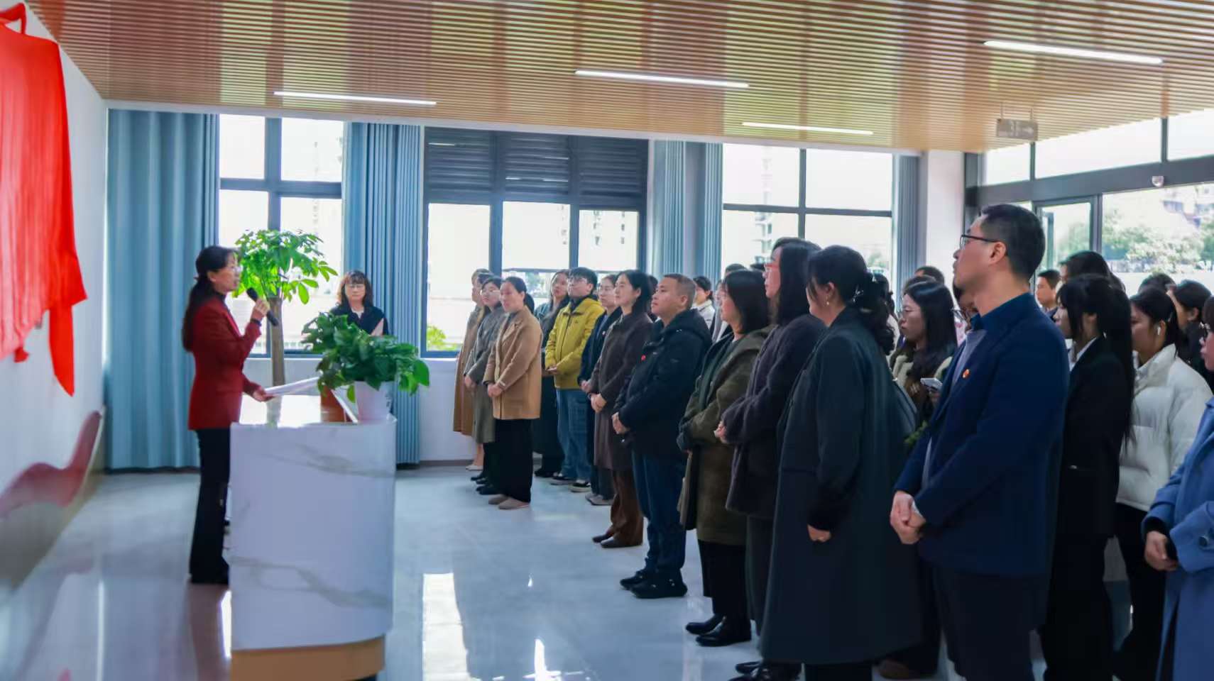 启动仪式上,周艳红介绍了一站式学生社区综合服务中心的建设情况。何旭娟致辞,她指出一站式学生社区综合服务中心是学校推进学生社区治理体系建设、延伸育人阵地、提升服务效能的重要载体,希望中心始终坚持学生主体地位,聚焦学生实际需求,不断优化功能布局和服务内容,切实把学生社区建设成为服务学生成长成才的温馨空间。随后,学生代表张艺馨发言,与会领导共同为一站式学生社区综合服务中心揭牌。
