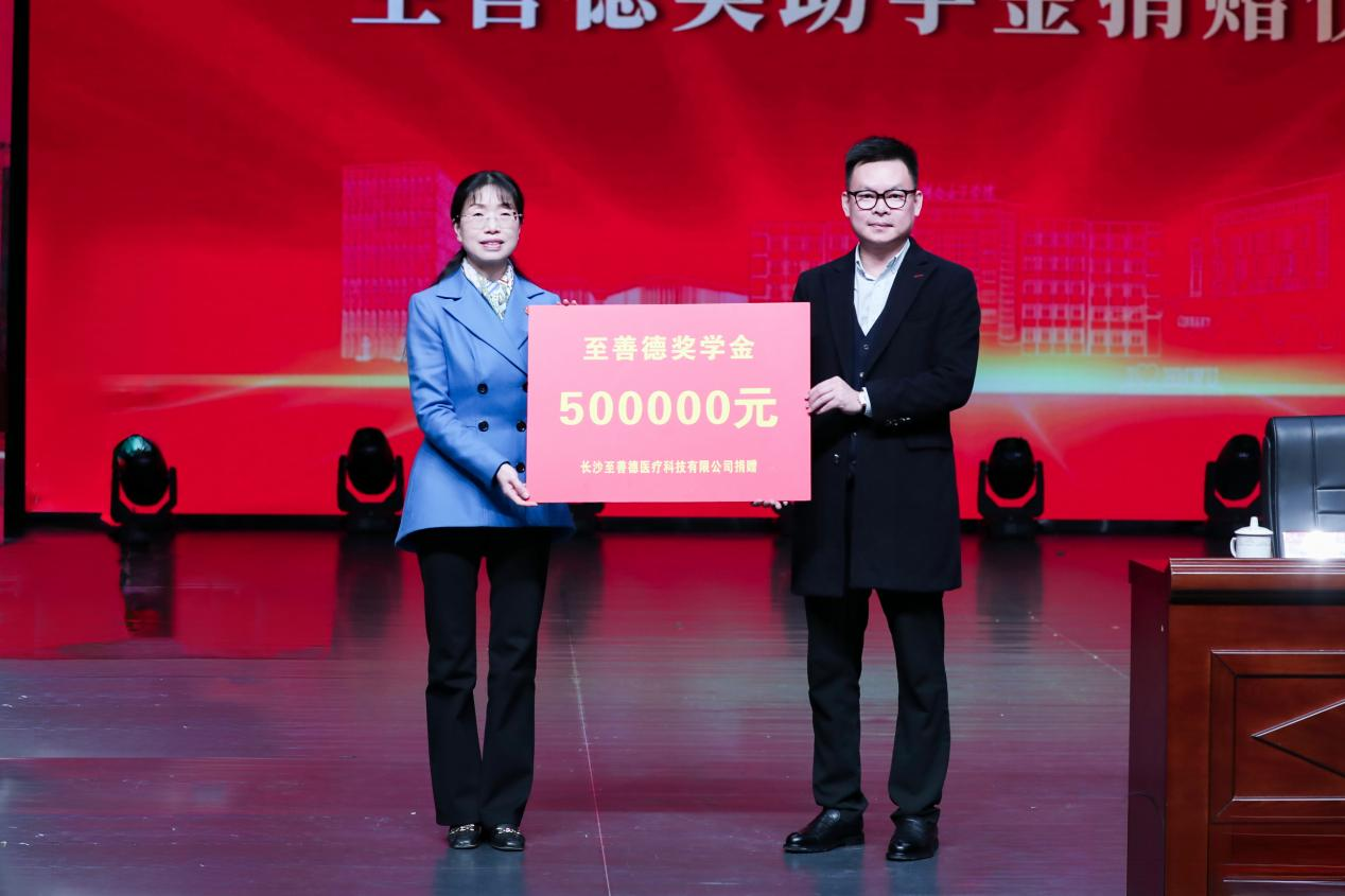 捐赠仪式上,长沙至善德医疗科技有限公司向学校捐赠人民币50万元,设立“至善德”专项奖助学金,用于奖励和支持品学兼优的在校学生。