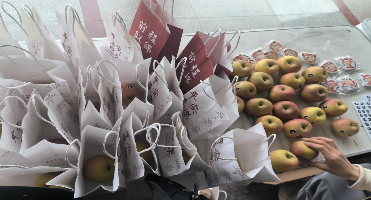 下午13:30,活动准时开始。现场准备了精美礼品袋、明信片以及丰富的手工 DIY 材料。同学们带着各自精心准备的小礼物,在工作人员的引导下,亲手制作创意水果,将这份承载巧思与祝福的作品,连同自备礼物和写有联系方式的明信片,一同装入礼袋中。