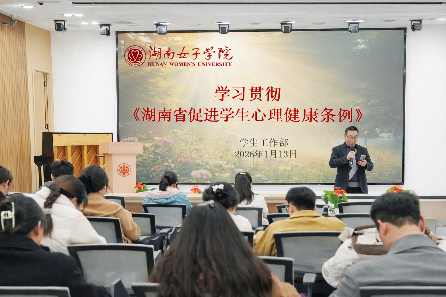 本网讯(学工部 钟沙沙)1 月 13 日,湖南女子学院多功能厅内氛围浓厚,两场聚焦学生心理健康工作的专题培训接连开讲。全校学工队伍齐聚一堂,沉浸式学习《湖南省促进学生心理健康条例》(以下简称《条例》)核心要义,系统掌握高校辅导员心理健康教育能力认证相关要求,为学校心理健康教育工作专业化、规范化升级注入强劲动力。