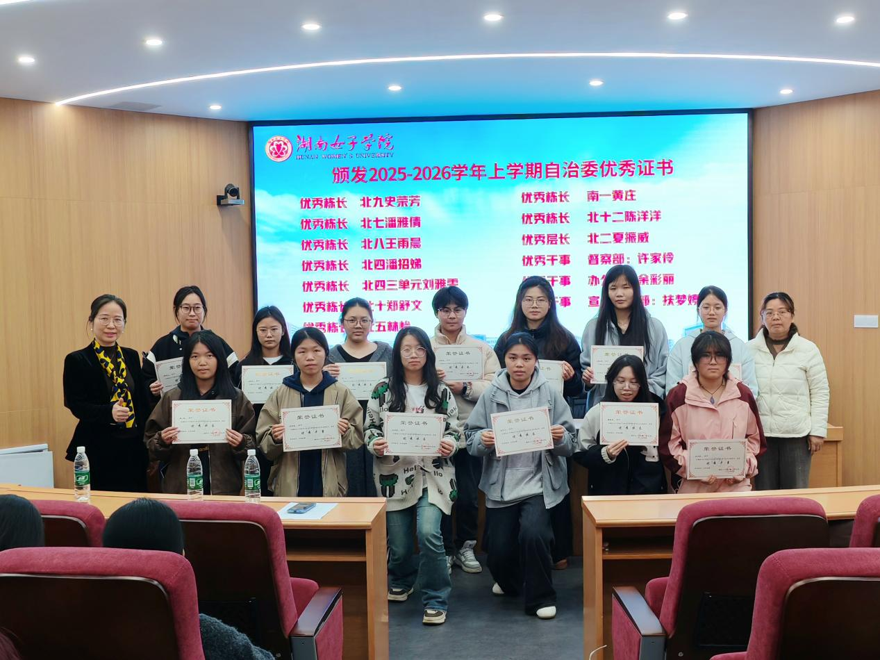 随后,于毅全面总结了自治委上学期各项工作,并邀请优秀栋层长代表分享日常宿舍管理、内务规范推进的工作经验与心得。会议同步对2025-2026学年上学期表现突出的优秀栋层长和干事进行表彰,与会领导为获奖同学颁发荣誉证书,充分肯定了学生干部在宿舍管理、学生自治工作中的先锋模范作用与辛勤付出。